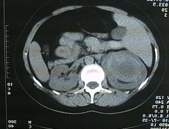 We are going to present the case of a female patient referred to our clinic with the initial ultrasound Author ? ? ? ?: Urology Department, Regional Hospital -Gjilan, UHC "Mother Theresa" Tirana, Albania, SLK Kliniken, Internal Medicine, Heilbronn, Germany. e-mail: [email protected] diagnosis of right giant renal cyst about 10 cm. Physical examination revealed no abnormalities. Given the result of the ultrasound (thick walls and small irregularities) and the possibility of a complicated cyst, we decided to investigate the matter further, and programmed the patient for an enhanced abdominal computer tomography with intravenous contrast.