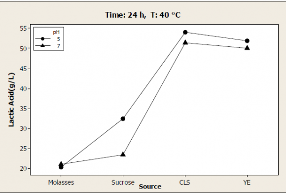 In the case of better treatments related to the use of the raw material of yeast extract and temperature of 37 C°, the production of lactic acid with pH = 7 and pH = 5 equals 59/43g/L and 60/90g/L, respectively.