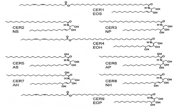 Figure 14: The molecular structures of the ceramides (CER) present in human stratum corneum [225], indicated according to the numbering system (based on chromatographic migration) and according to their structures. A, ?hydroxy fatty acid; H, 6-hydroxysphingosine; N, nonhydroxy fatty acid; P, phytosphingosine; S, sphingosine.