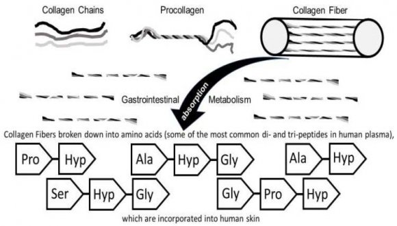 In 2016, the collagen market was valued at an estimated 3.71 billion USD and is projected to reach 6.63 billion USD by 2025. Collagen supplements, originating from various sources (eg, porcine, bovine, marine) and available in numerous formulations (eg, protein, gelatin, hydrolysate, peptides), are marketed as improving skin integrity and modulating skin aging. When denatured by heat, collagen forms gelatin, which has been used for centuries as a food source and traditional medicine in Europe and China. Further enzymatic hydrolysis of gelatin produces collagen hydrolysates (CH) composed of peptides of varying lengths, conveniently formulated into liquid drinks and jelly sticks for oral consumption. In the past decade, CHs have gained popularity as a nutraceutical supplement. Choi et.al, 2019 reported promising preliminary results for the short and long-term use of oral collagen supplements for wound healing and skin aging. Oral collagen supplements also increase skin elasticity, hydration, and dermal collagen density. However, even with this increase in patient interest and market share, the use of collagen supplementation in dermatology remains controversial due to the lack of regulation on quality and quantity of ingredients in OTC collagen supplements [164], [171]. Maria et.al, 2019 reported improvement of general skin conditions, acting in different mechanisms by oral supplementation and topical application of hydrolyzed proteins [165]. Proksch et.al, 2014 reported significant improvement in after 8 weeks of supplementation in women aged 35-55 years but study failed to reach a level of statistical significance with regard to skin moisture and skin evaporation [166]. Oral administration of Low-molecular-weight Collagen peptide (LMWCP), which is a fish-derived collagen hydrolysate, promotes recovery of collagen fibers and normal elastic fibers in the skin from degraded collagen and abnormal elastic fibers caused by UVB irradiation in hairless mice [167]. Kim et.al, 2018 reported that LMWCP is a safe health functional food ingredient with anti-skin photoaging efficacy which can effectively improve hydration, elasticity, and wrinkling in human skin at the dose of 1000 mg once daily [168]. Oral supplementation with collagen bioactive peptides (hydrolyzed fish collagen) combined with chondroitin sulphate, glucosamine, L-carnitine, vitamins, and minerals significantly improved the clinical parameters related to skin aging and joint health [169]. Lee et.al, 2019 reported that orally administering collagen peptide NS (CPNS) to rats, the plasma concentrations of Gly-Pro and Pro-Hyp increased dramatically. The CPNS consumption significantly attenuated UVB-induced wrinkle formation, transepidermal water loss, and epidermis thickness, and increased skin hydration [170]. An association between oral administration of collagen peptides combined with vitamin C and extracts of Hibiscus sabdariffa and Aristotelia chilensis was observed by Addor et.al, 2018. adult patients received an oral nutritional supplement from a sachet and were instructed to consume 1 sachet diluted in 200 mL of water once daily for 12 weeks. Clinical evaluation by high frequency ultrasound and cutometry showed significant improvement of firmness and elasticity and an increase in dermal thickness by ultrasound after 3 months of use [171]. Zague et al, 2018 reported that collagen peptides modulate the metabolism of extracellular matrix proteins by human dermal fibroblasts (in culture) that were derived from sun-protected and sun-exposed body sites [172]. Song et al, 2017 examined the effects of collagen hydrolysates from sliver carp skin on UV-induced photoaging in mice and found that LMW peptides exerted beneficial effects when compared to high molecular weight CHs on HA levels and moisture content of the skin [173].