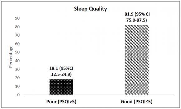A total of 160 patients with type 2 diabetes mellitus were recruited for the study. The sociodemographic and clinical characteristics of the patients are shown in Table .1. The mean (SD) age of the patients was 55.5 (12.1%) years. One-fourth of patients had Diabetes Mellitus for more than five years. Almost three-fourth (117 patients) had uncontrolled PPBS, and three-fifths (94 patients) had uncontrolled FBS; in total, 79.4% (n=127) had an uncontrolled type 2 diabetes mellitus status. The proportion of patients with HbA1c > 6.1 was 91.9%. Quality of sleep was deficient in 18.1% (95% CI 12.5-24.9) (Figure .1). Around two-fifths (n=61, 38%) reported hypertension as co-morbidity.