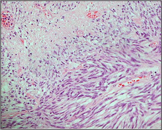 The results obtained by the ten participating pathologists and the two neuropathologists are summarized in Table 1. The kappa score for interobserver agreement between the ten anatomical pathologists was 0.53 (95 % CI for free-marginal kappa [0.32, 0.74]) with an overall agreement percent of 68.44%. The kappa score for interobserver agreement between the two neuropathologists was 0.55 (95 % CI for free-marginal kappa 0.1, and 1) with an overall agreement percent of 70%. Both kappa scores are in keeping with above chance "intermediate to good" agreement (7). The cases that showed 100% agreement were three cases. Two cases were WHO grade I. The third case was WHO grade II (Case 2, Figure 1). The latter was the only meningioma from the selected cases that showed focal necrosis. Another five cases were graded as either WHO grade I or WHO grade II by the reviewers. These cases were showing a variable degree of small cell change, lack of pattern, and cellularity (Figure 2).These cases did not show features of necrosis or prominent nucleoli. Two cases (Cases 8 and 9) were labelled as WHO grade II by the majority of the reviewers. However, in each one of them, two reviewers labelled them as WHO grade III (Figure 3). In their opinion, the reason for such designation was the focal presence of sarcomatoid morphology.
