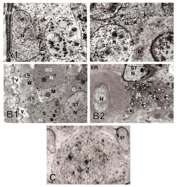 The spermatogonia were large diploid cells that lied against the boundary tissue of the seminiferous tubules. The A-type spermatogonia had large pale ovoid nuclei, a scantly granular cytoplasm, and rough endoplasmic reticulum, the mitochondria were spherical or ovoid, and a simple Golgi apparatus. The B-type cells had rounded nuclei, and a granular cytoplasm. Primary spermatocytes had spherical nuclei with fine granular nucleoplasm, scanty cytoplasm, and ovoid mitochondria that aggregated in groups, the Golgi apparatus arranged in few clusters accumulated at one pole of the cell. The secondary spermatocytes were rarely seen, they entered into the second meiotic division producing the spermatids. The early spermatids were rounded cells with large spherical nuclei that contained clumps of chromatin in a lightly stained cytoplasm, the endoplasmic reticulum had flattened vesicles, the mitochondria aggregated at the periphery of the plasma membrane. The cytoplasm of Sertoli cells extended from the basal lamina to the lumen of the seminiferous tubules. The nucleus was enfolded and the cytoplasm contained abundant endoplasmic reticulum, ovoid Golgi apparatus and spherical mitochondria (Figs. 4-A1 & A2).