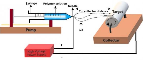 Electro-spinning is the latest and the most preferred method to prepare nanocomposites. During electro spinning, the blend of a polymeric solution is drawn through a syringe and high power voltage is being applied to the polymeric solution by an alligator clip attached to the syringe needle. The volt is accustomed to 15kV. The polymer is administered through the blunt needle end, utilizing the syringe pump to regulate the flow rate of the solution. The fibers are collected on an electrically grounded foil of aluminum mounted to the tip of the needle at 15 cm vertical. A few process parameters for optimization include polymer concentration, voltage applied, distance between syringe tip and collector foil, solution flow rate, etc. Polymer nanocomposites, metal-based nanocomposites are prepared by this method. The preparation of nanocomposites by electro spinning is depicted below in Fig. 4