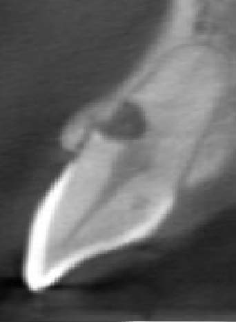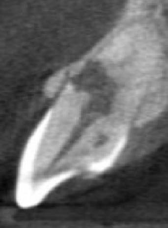 The CBCT revealed intraroot perforating resorption on the vestibular root surface. In addition, a possible cause of resorption was identified as Oehlers' Type I invagination (1957), which was based on the radiological findings. According to the classification, Type I invagination is covered with enamel and is located within the coronal part, extending no further than the enamel-dentin junction. The authors believe that the infected invagination zone with subsequent creeping infection of the root pulp brought about the resorption. The response to the cold stimulus was very insignificant, especially in comparison with tooth 12. This made it clear that an irreversible destructive process is going on in the damaged tooth. Since the patient was planning orthodontic treatment and the resorption process could grow worse, it was decided to conduct endodontic treatment.