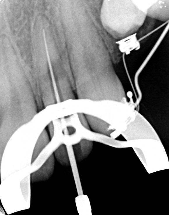 Also, there were signs in favor of internal resorption. The defect was below the cervical part, which is not typical of external cervical resorption. The response to cold stimuli reduced, which is not characteristic of external resorption, as it affects the pulp only in the last stages of tooth structures decay. Furthermore, the X-ray obliteration of the root canal beyond the resorption area is not characteristic of external resorption. Visit 1: Pre-op X-ray plus anesthesia with sol. Ubisthesini 4% -1 ml, isolation with rubberdam. The access was made as close as possible to the incisal edge. When opened, at first glance the pulp chamber looked quite II.