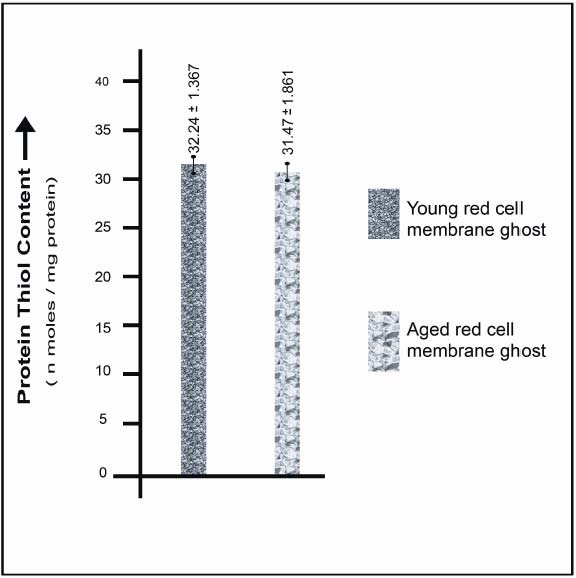 Various types of membrane alterations have been reported to aged red cells, which were linked to oxidative damage [2,3,18,19]. In the present study increased carbonyl content to aged RBC membrane, observed both in spectrophotometric and immunedetection assay system (Fig- 3, Fig- 4) with respect to that of young red cell membrane ghosts represented that the aged red cells have been subjected to oxidative stress in vivo which had been considered as the hall mark of oxidative protein damage [55]. That result seemed interesting, as no such information was available in aged erythrocytes except for an isolated study on stored RBC in blood bank [22]. Again, we have observed no significant alteration in membrane protein thiol content of aged red cells compared to young cells (Fig- 5). That was in conformity with our in vitro result, where oxidative stress and ascorbate failed to cause measurable change in protein thiol content of RBC membrane ghosts after incubation up to 2 h (Table-2). Our result [63].