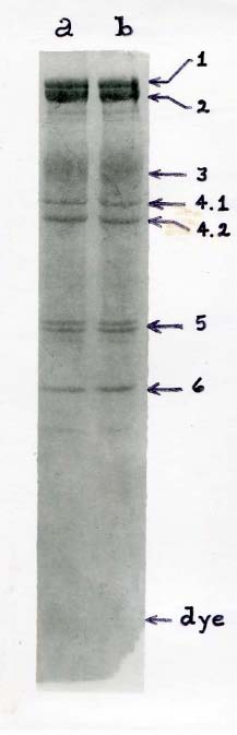 membrane after it was dried. The other half of the j) Fig- 5 showed that there was no significant decrease in protein thiol content in aged RBC membrane ghosts compared to young RBC membrane ghosts. k) SDS-PAGE of young and aged erythrocyte ghosts showed that there was no such remarkable difference in the band pattern of membrane proteins (Fig- 6), and especially no cross-linked high molecular weight proteins or evidence of protein fragmentation was apparent in aged erythrocyte. l) As presented in Table-6, autologous IgG binding to aged erythrocyte ghosts was more than 2.5 fold higher than that of young erythrocyte ghosts, when incubation was carried out with IgG concentration of 1 mg/ml. Raising IgG concentration to 2.5 mg/ml, IgG binding to aged red cell ghosts was about 3.7 times more than that of young erythrocyte ghosts.